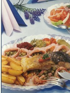 Postup: Porce kapra protkneme slaninou a šunkou. Kapra osolíme, vložíme do vyšší vrstvy oleje, přidáme hrášek a pečeme. Upečeného kapra podáváme s rajčatovým salátem nebo obkládáme sterilovanou zeleninou jako minutku.